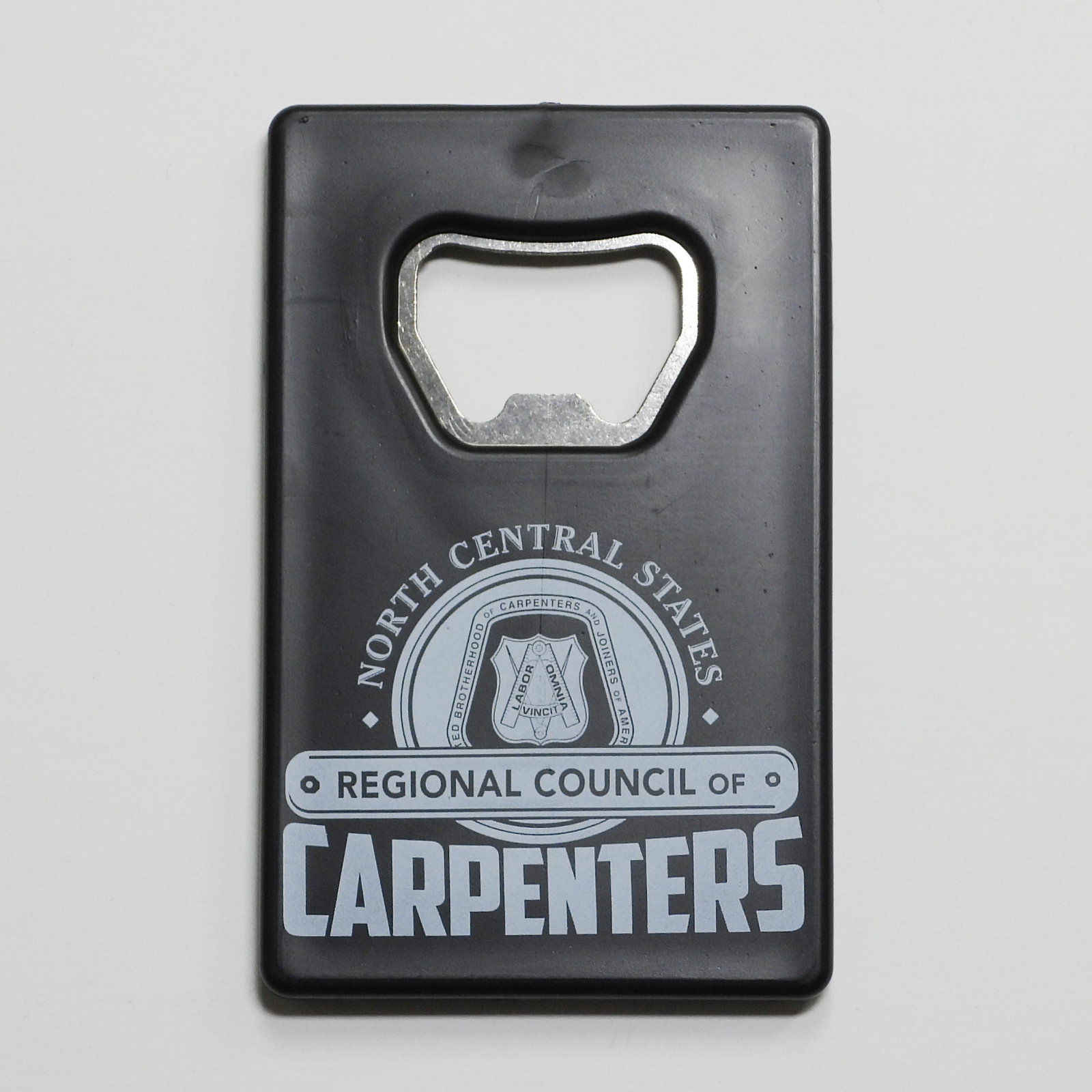 Black and white bottle opener, credit card size to easily fit in a wallet.