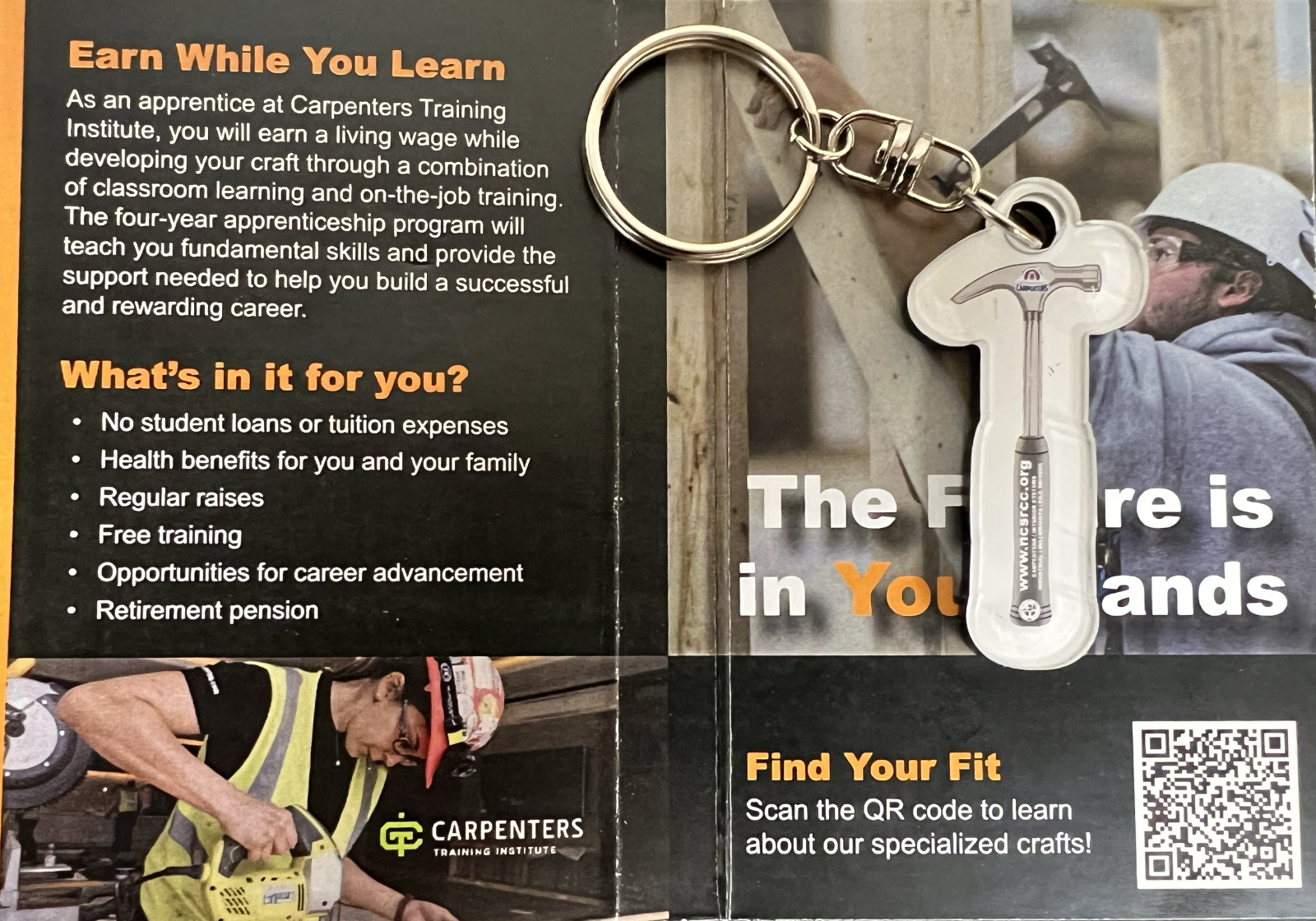 3.25x2.75 inch recruitment booklet with hammer keychain.