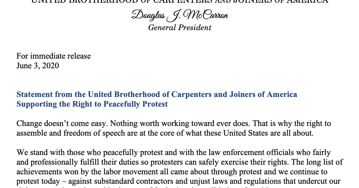 Statement from the United Brotherhood of Carpenters and Joiners of America Supporting the Right to Peacefully Protest
