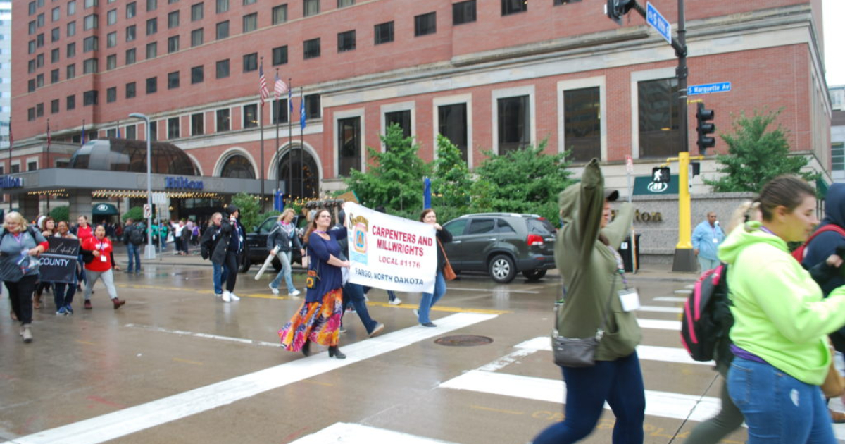 Carpenter and Millwright Sisters from North Dakota walk in the Tradeswomen parade in downtown Minneapolis.
